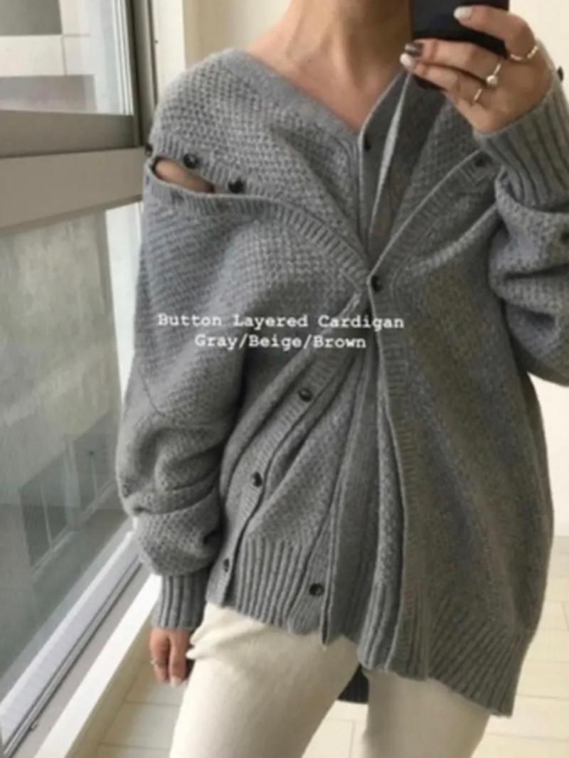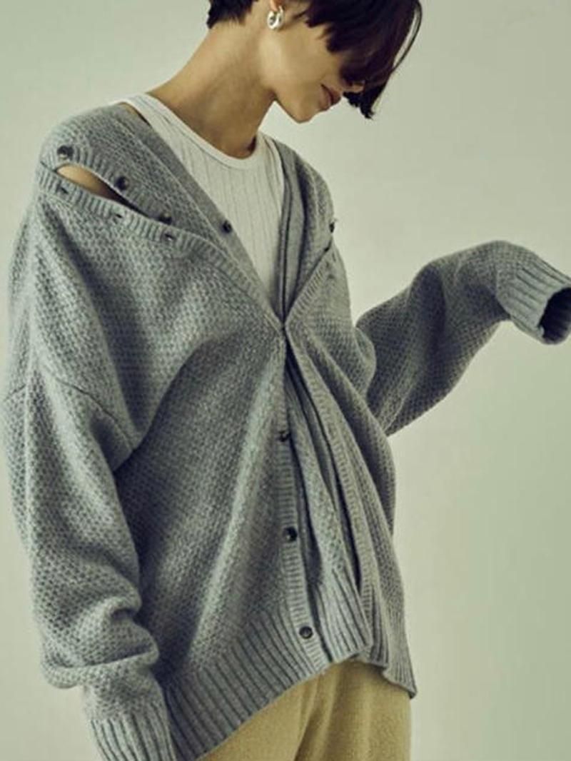 リトルスージーのボタンレイヤードカーディガン。 柔らかいニット編地のオーバーサイズシルエット。 ボタンアレンジで様々な着こなしを楽しむことができます。