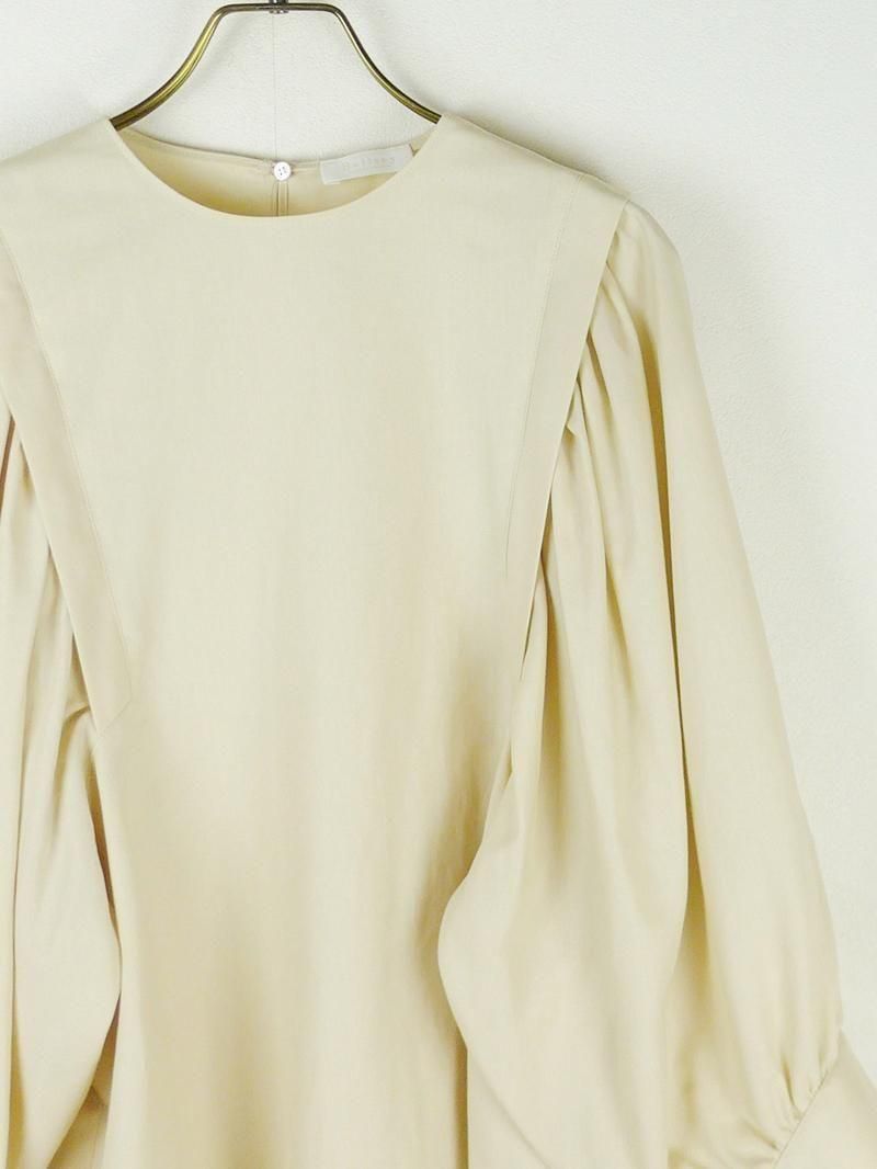 アームホールと袖口にギャザーをたっぷりと寄せたフェミニンなスリーブデザインでボリュームがありつつも、肩位置を中央に寄せることで華奢に見えるようこだわった一着。