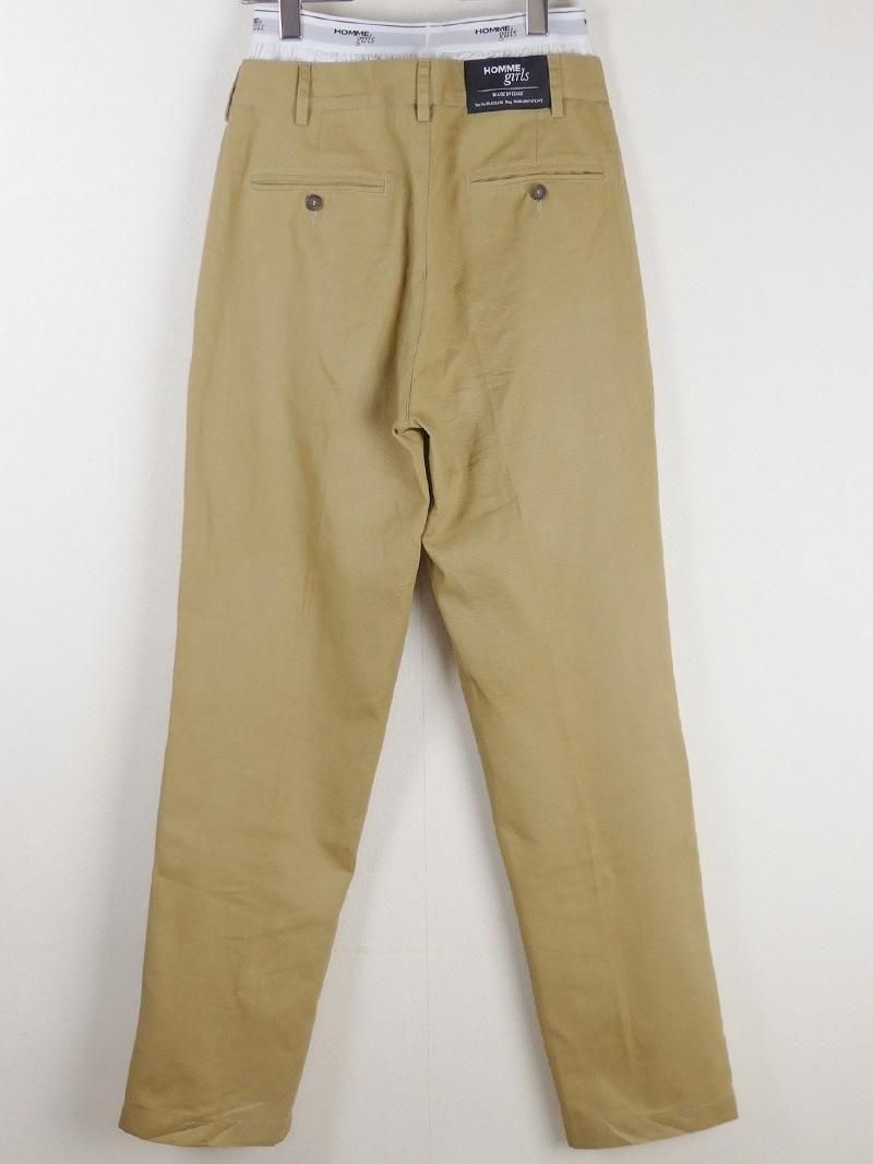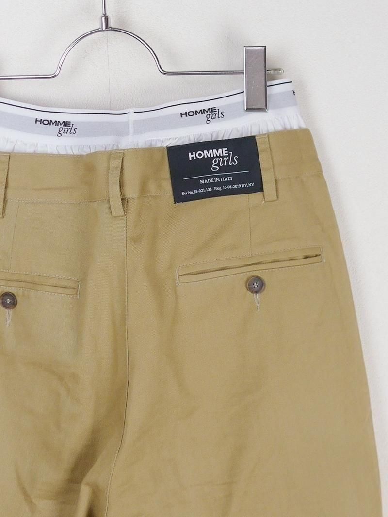 コットンチノ素材のスリムトラウザーと、メンズのボクサーパンツ(ホワイト・コットンブロード)を重ねた、HOMMEgirls人気のレイヤードパンツです。