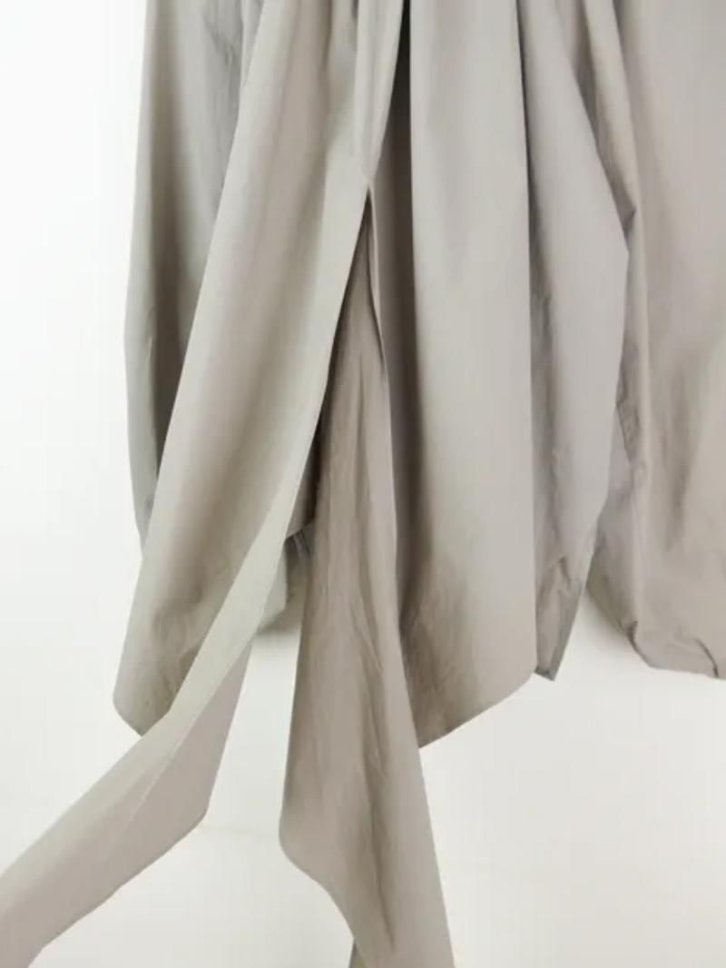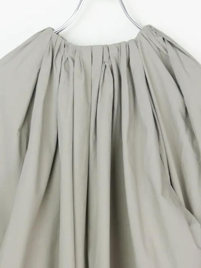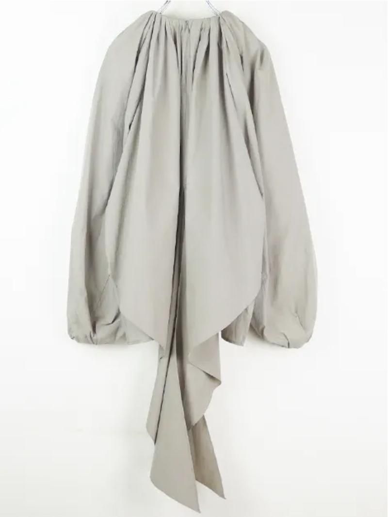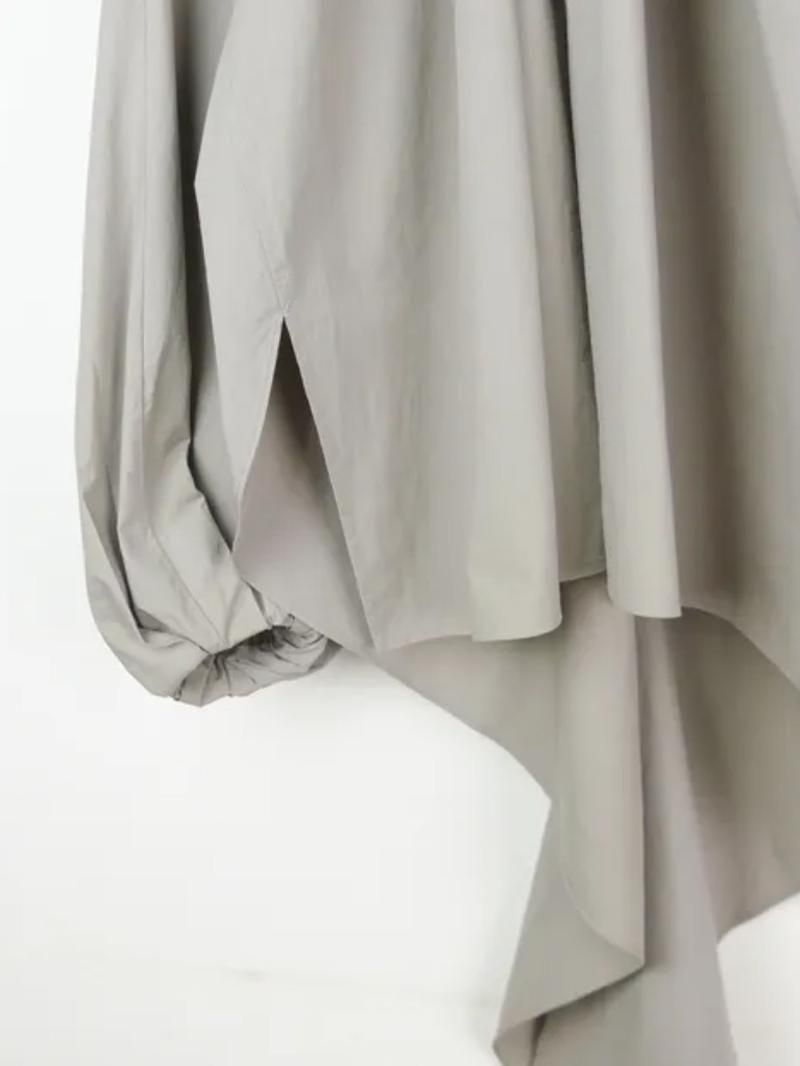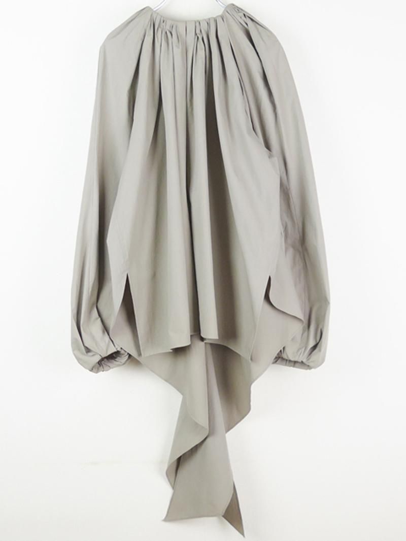 タック・ギャザーを駆使したボリュームシルエット。バルーンスリーブ。サイドスリット入り。