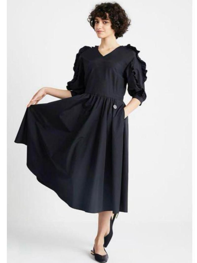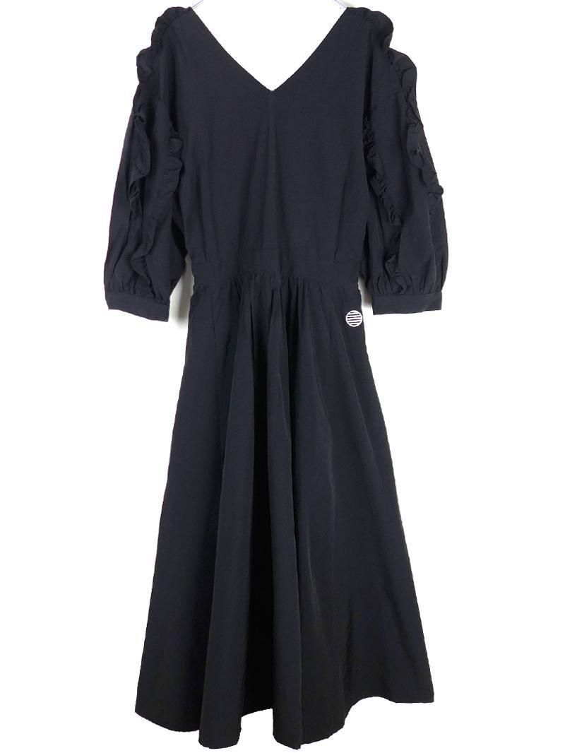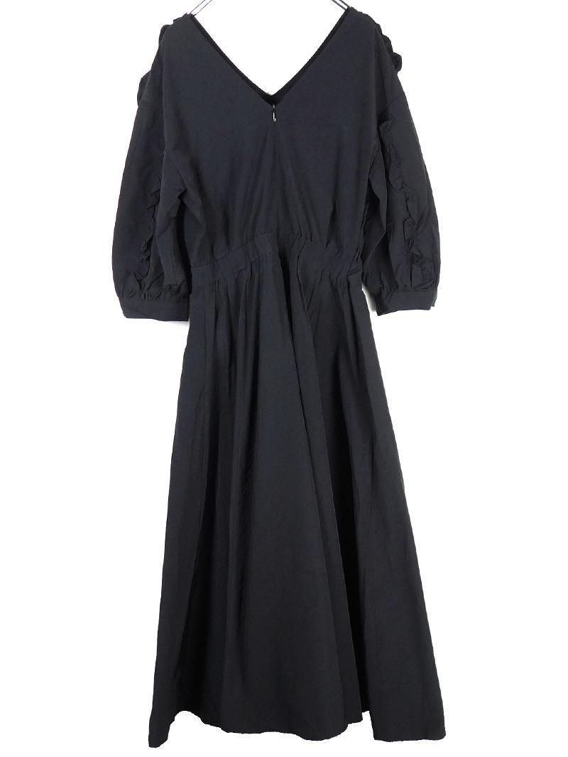 フリル付きのハーフスリーブがかわいい、前後Vネックのワンピース。
