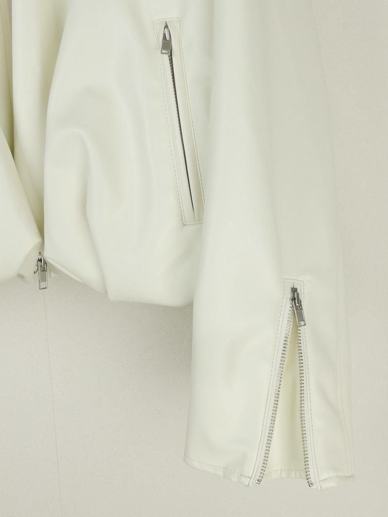 フライトジャケットのディテールに、ドット釦やファスナーのメタルパーツがアクセントのエコレザージャケット。