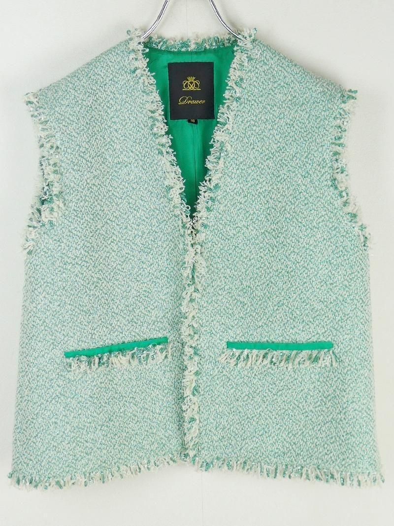 煌めくグリーンのツイード素材が映えるジレ/ベスト。