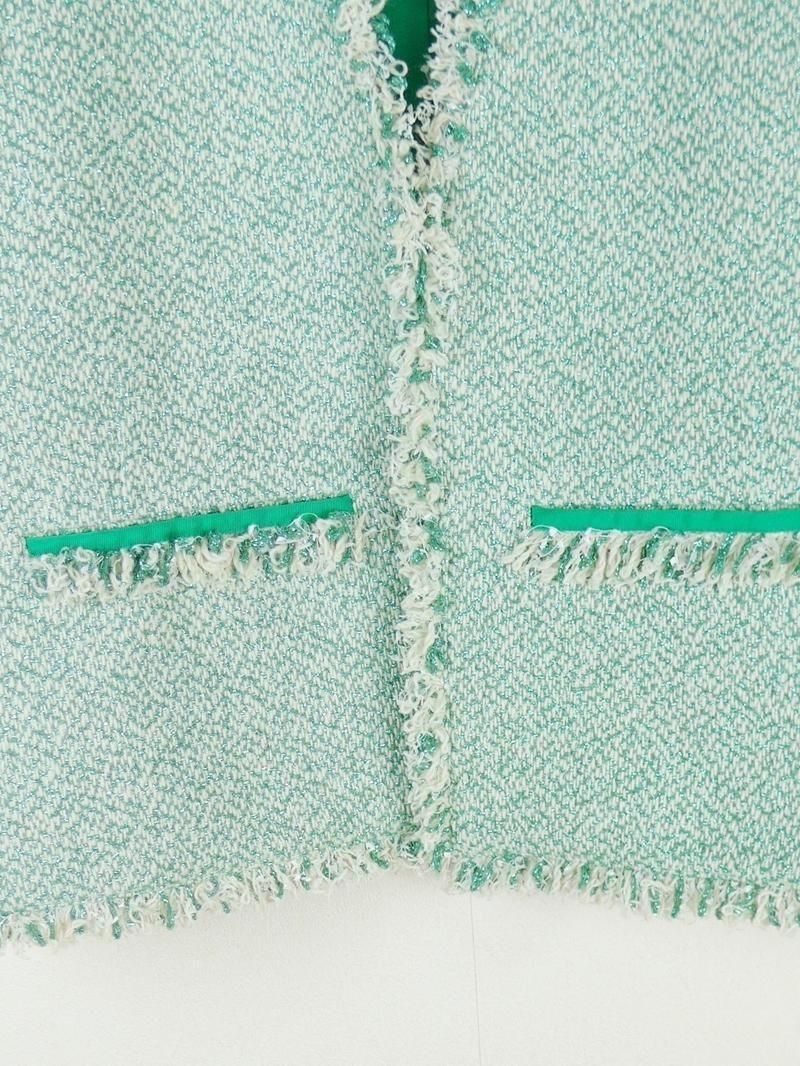 ケリーグリーンのラメ糸を使用した華やかな雰囲気のあるツイード素材を使用。