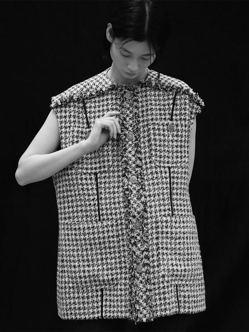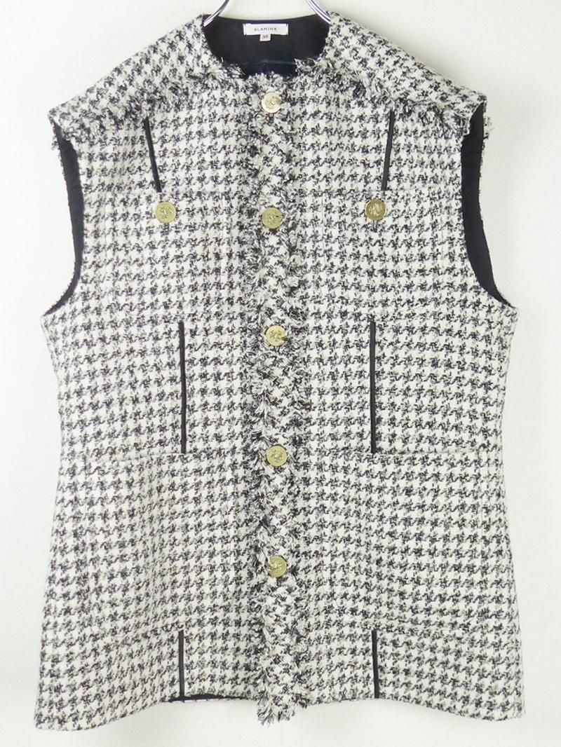 ブラミンク2022AWの人気完売アイテム、ラメツイードフリンジジレ。