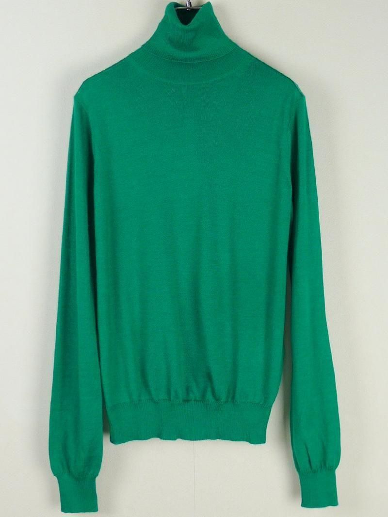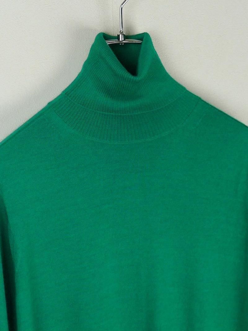 ドゥロワーのカシミヤシルク18Gタートルネックニット。 定番カシミヤシルクハイゲージニットのタートルネックプルオーバー。 上品なケリーグリーン。 色違いで何枚あってもいい、使える一枚です。