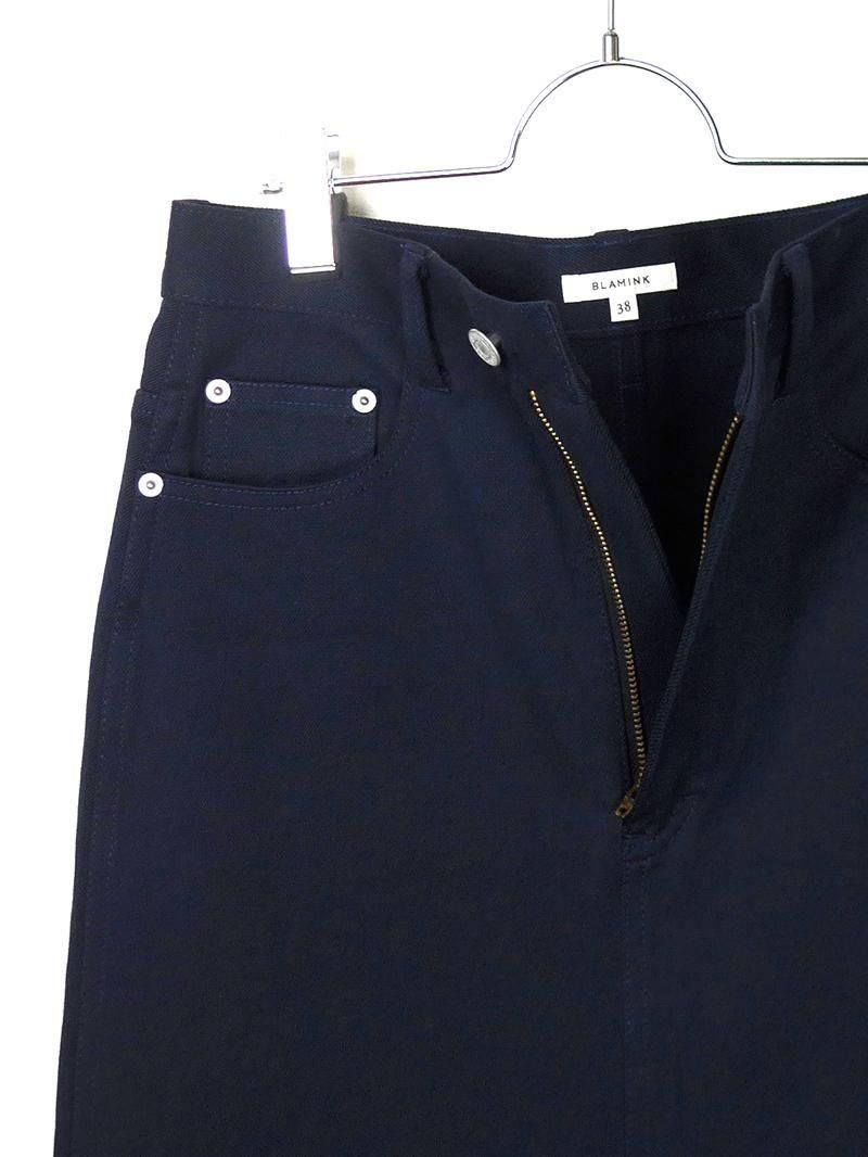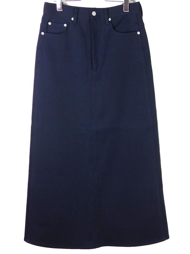 すっきりとしたナローなロングAラインが美しい、BLAMINKらしい高級感を纏うネイビーデニムスカート。