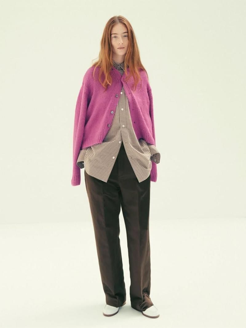 ボリュームのあるボトムスとのバランスがとりやすいコンパクトなサイズ感のワイドカーディガン。