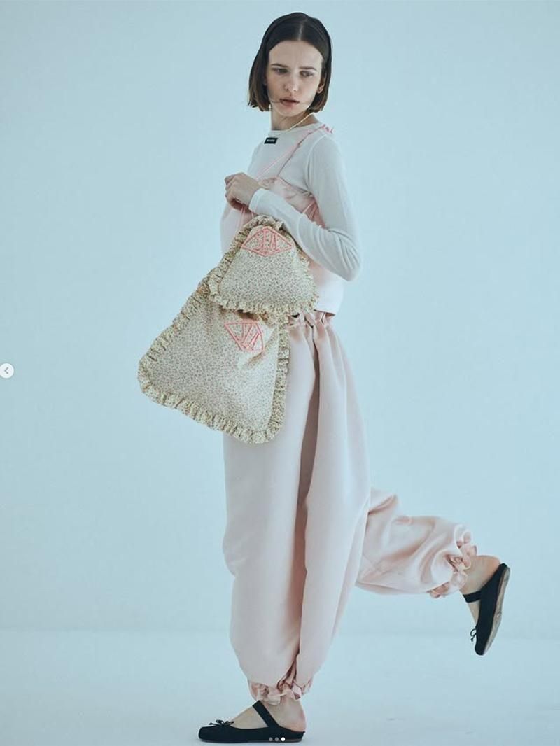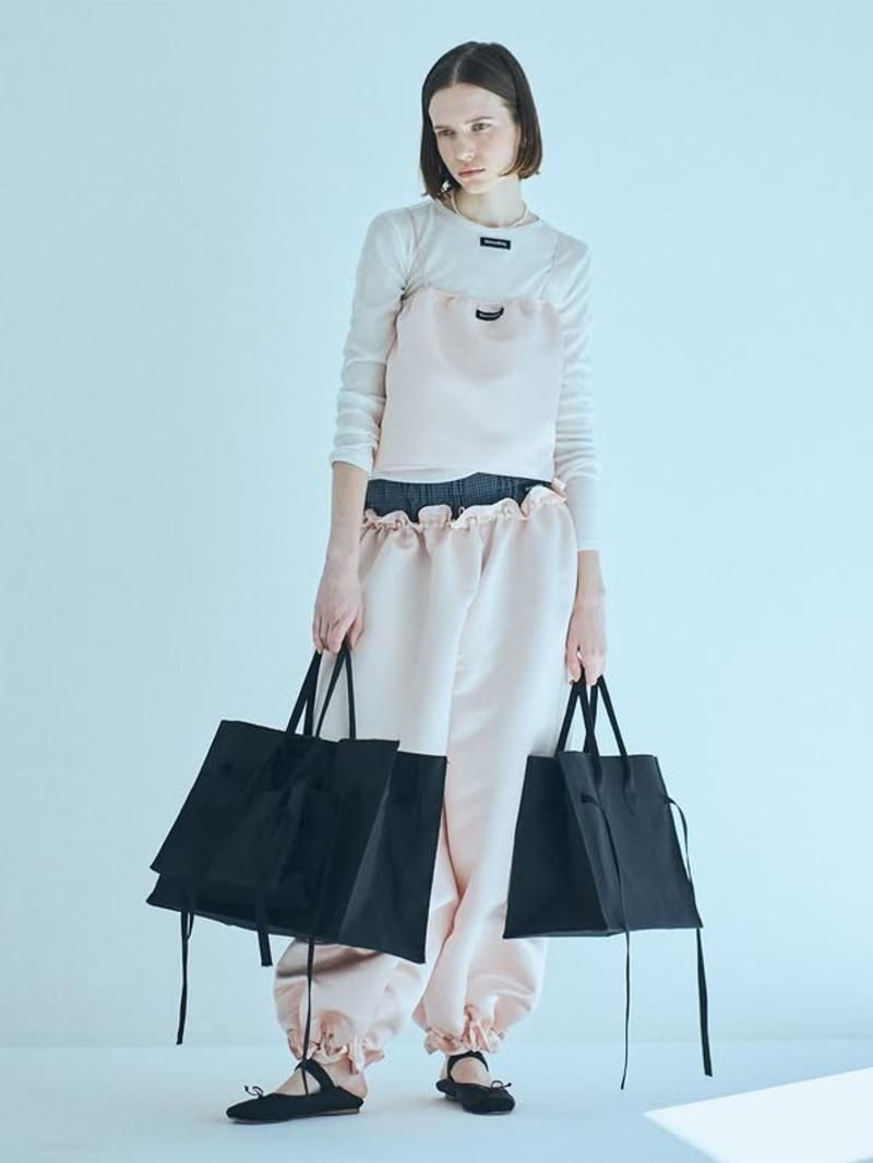 ヘビーサテンの厚みとハリが実現させたボリューム感のあるフォルムと華奢なサテン紐の組み合わせがメリハリのある華やかな印象。