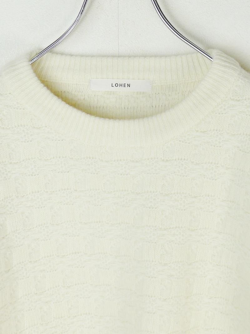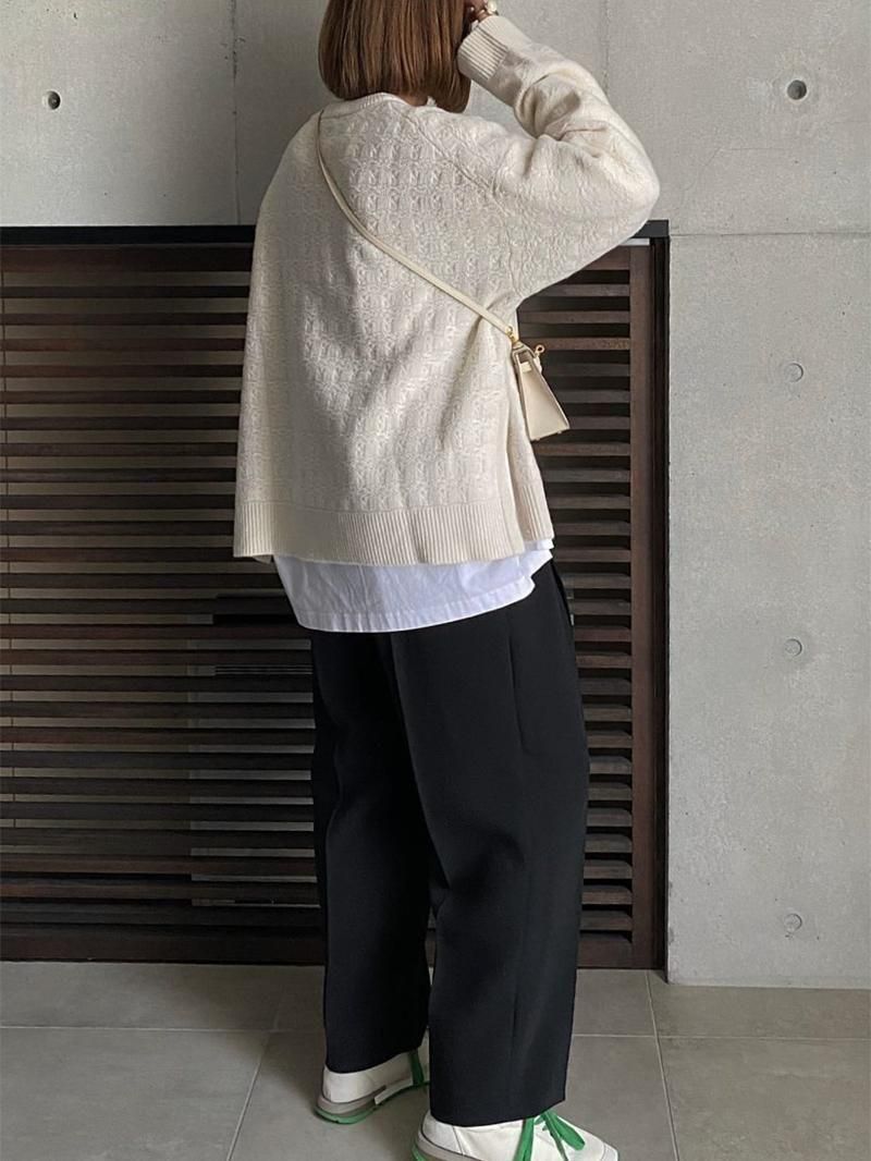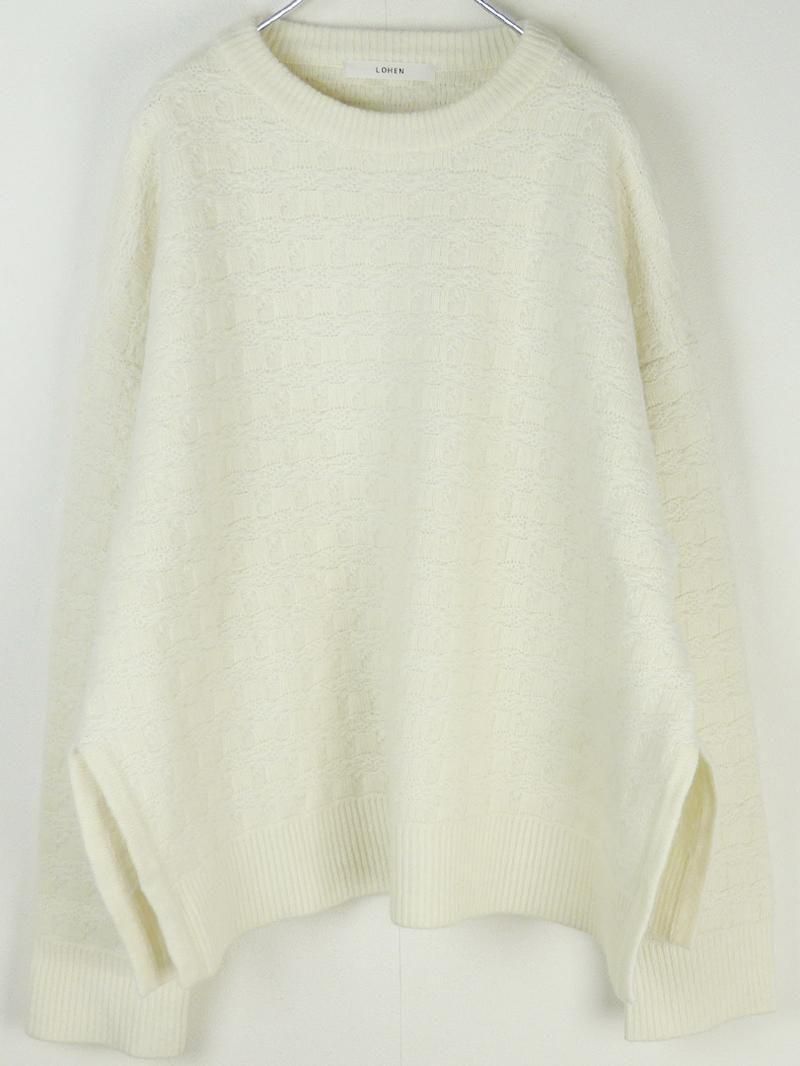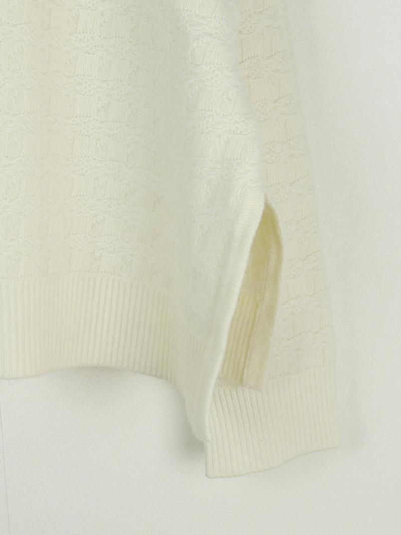 変則的に袋状に編んだジャガード柄は、優しい凹凸感と暖かみがあり、たっぷりとしたシルエットでも軽さのある1枚です。
