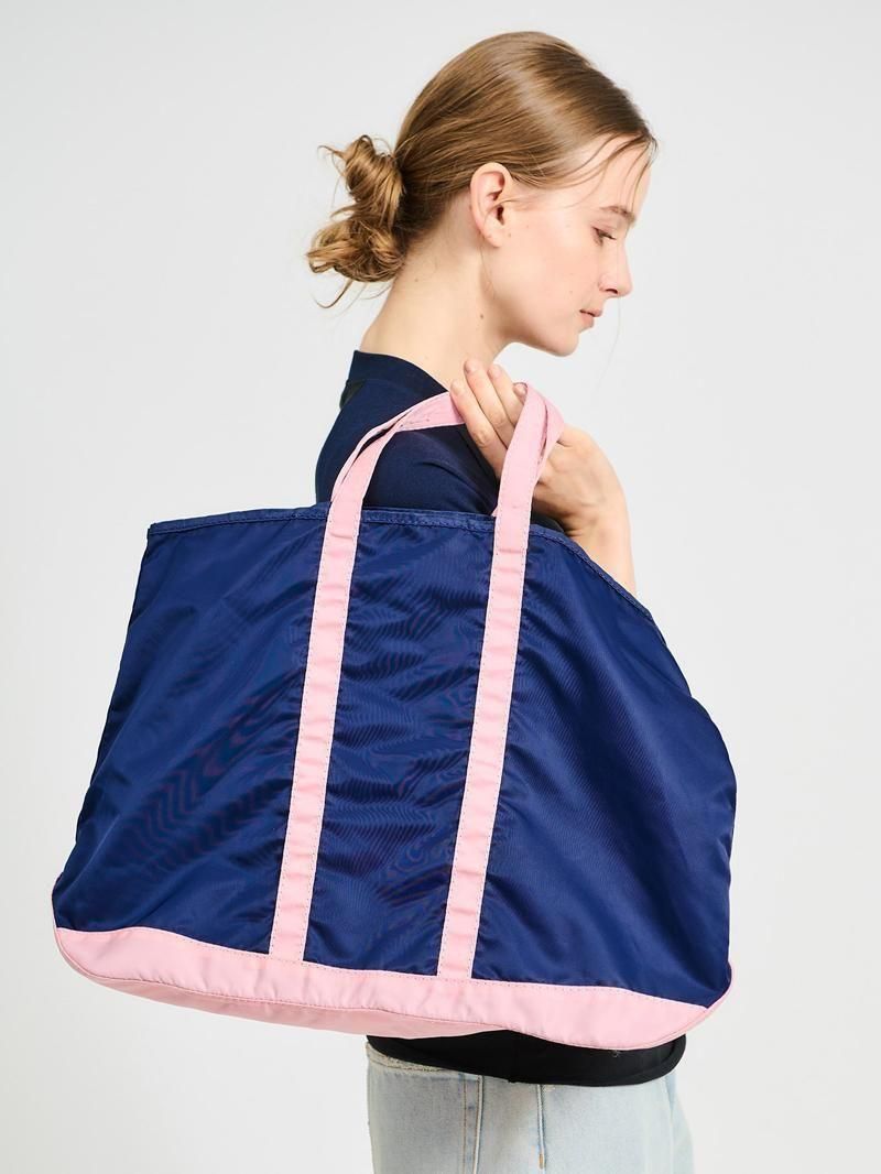コーディネートのアクセントになるネイビー×ピンク。艶感のある素材がカジュアルな中に上品な印象を。