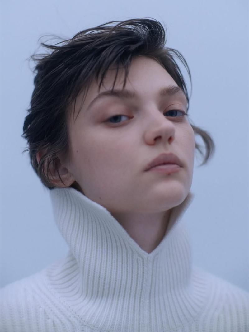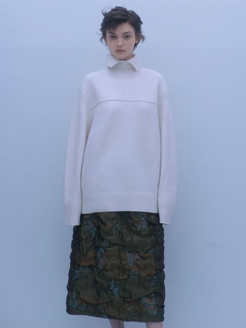 フロントセンターにスリットを入れたタートルネックが新鮮なニットプルオーバー。