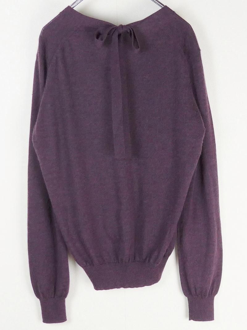 ドゥロワーのロングセラーアイテム、バックリボンVネックニット。 最高級梳毛カシミヤ・シルク素材の18ゲージニット。Vネック。バックリボン。 光沢感のある上品なパープル。 色違いで何枚あってもいい、使える一枚です。