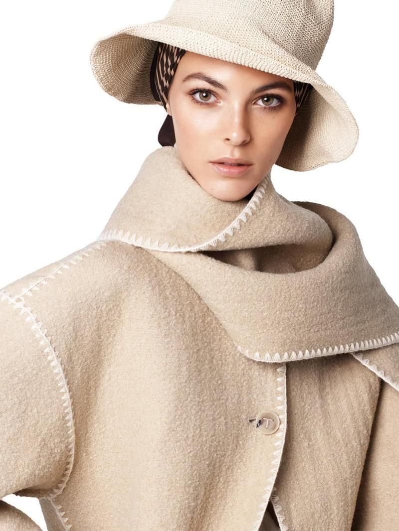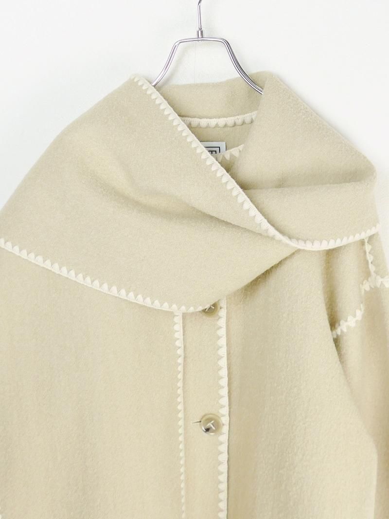 ノーカラー襟に共布スカーフをドッキングしたレイヤードスタイルのコートジャケット。