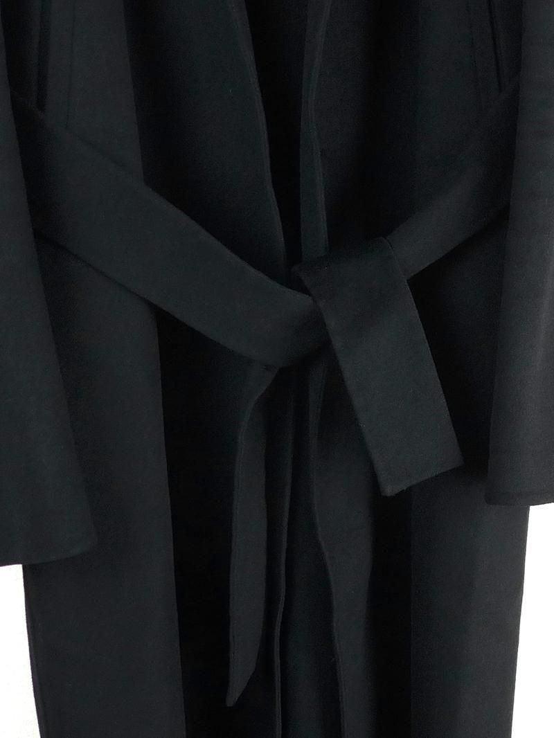すっきりボタンレスのIラインシルエットを、ベルトで留めるラップコート仕様。