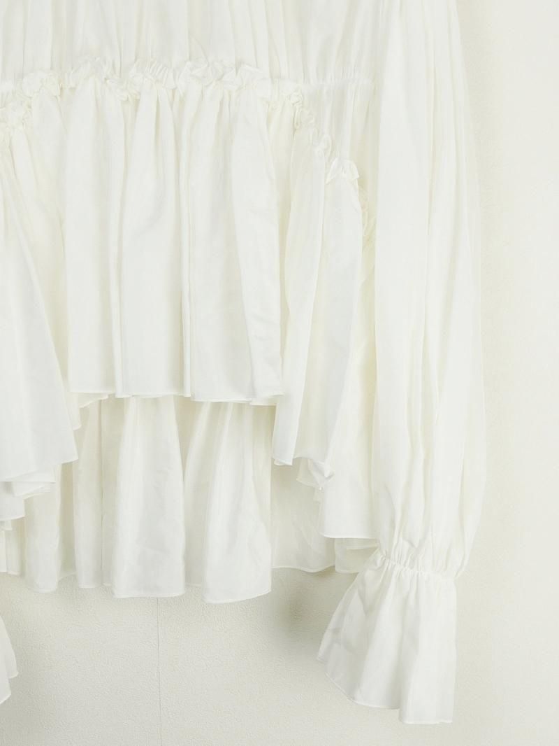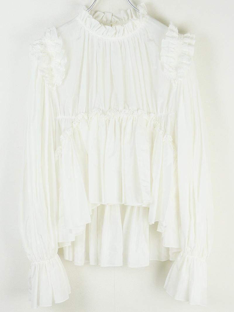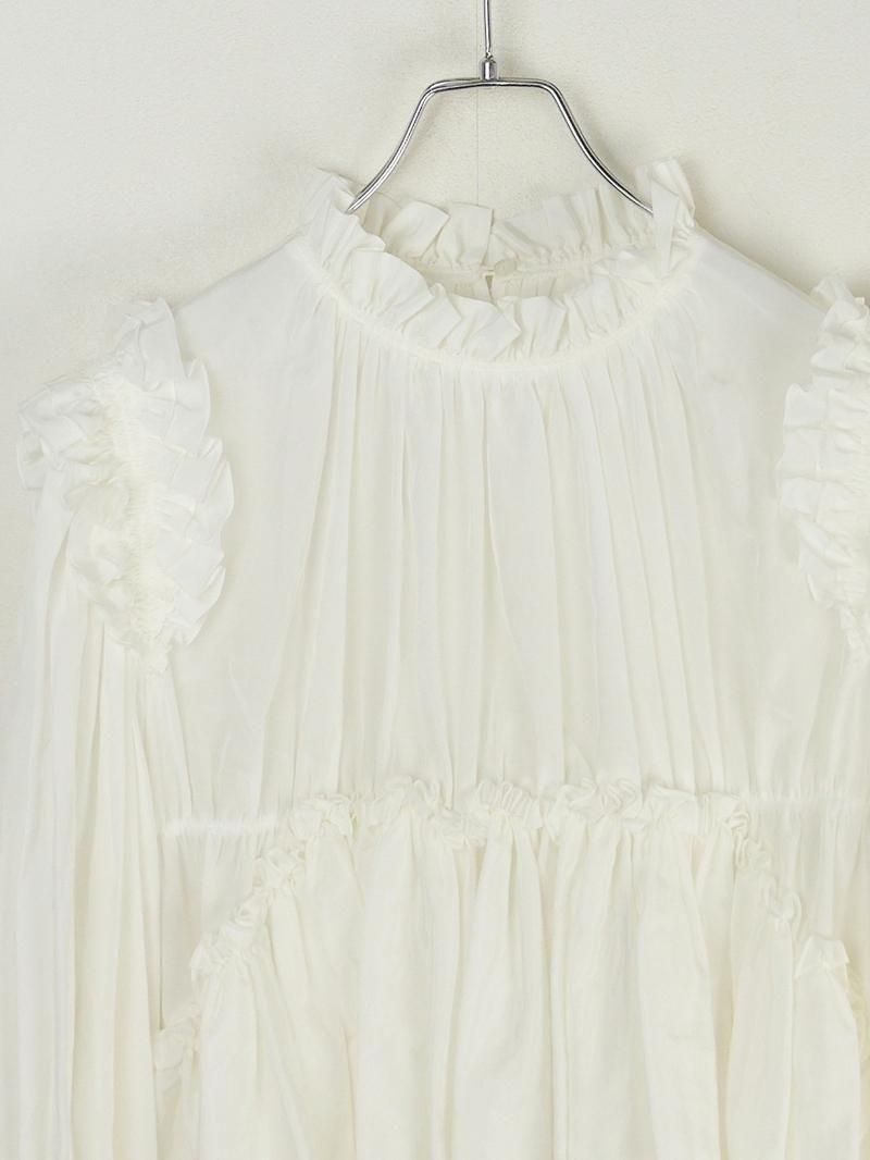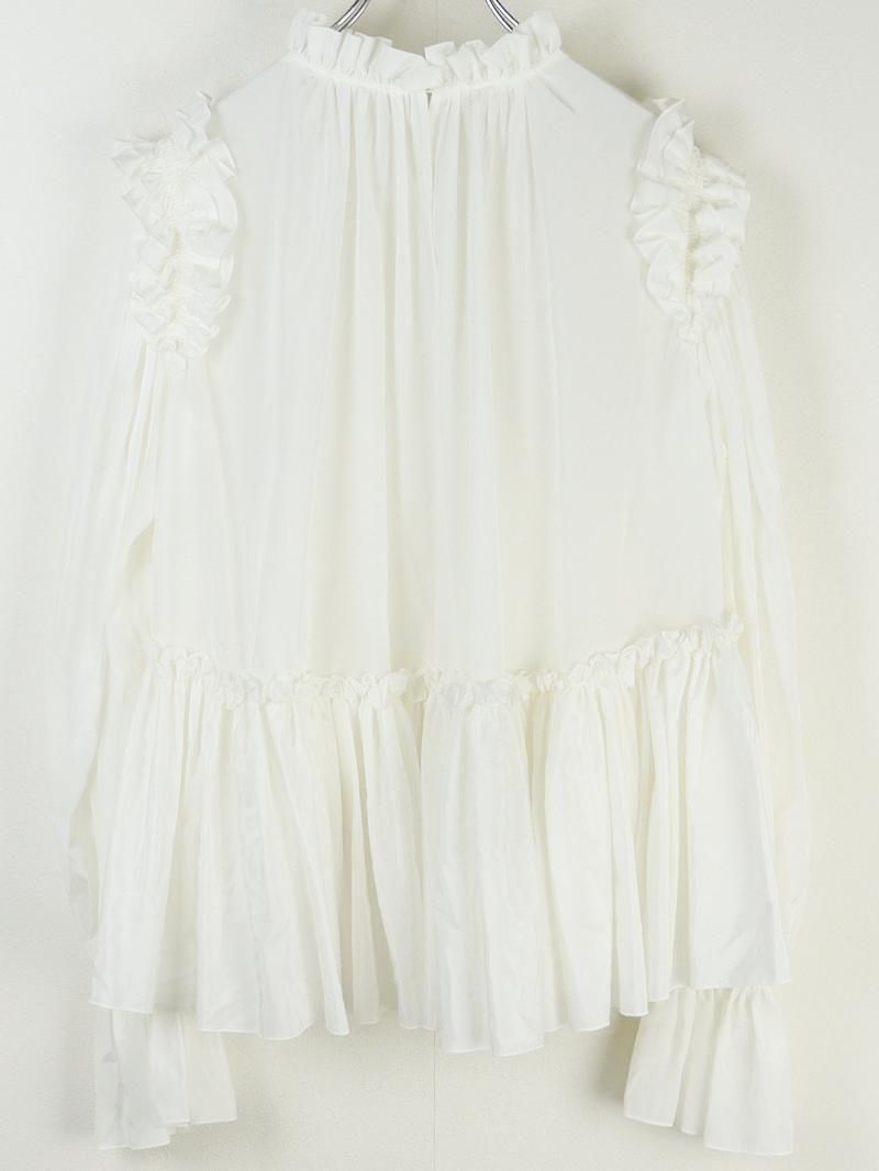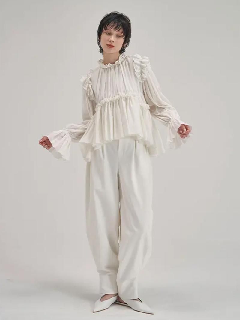 顔周りにフリルディテールをふんだんに使用しており、一枚でコーディネートを華やかにしてくれるブラウスです。