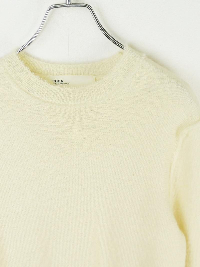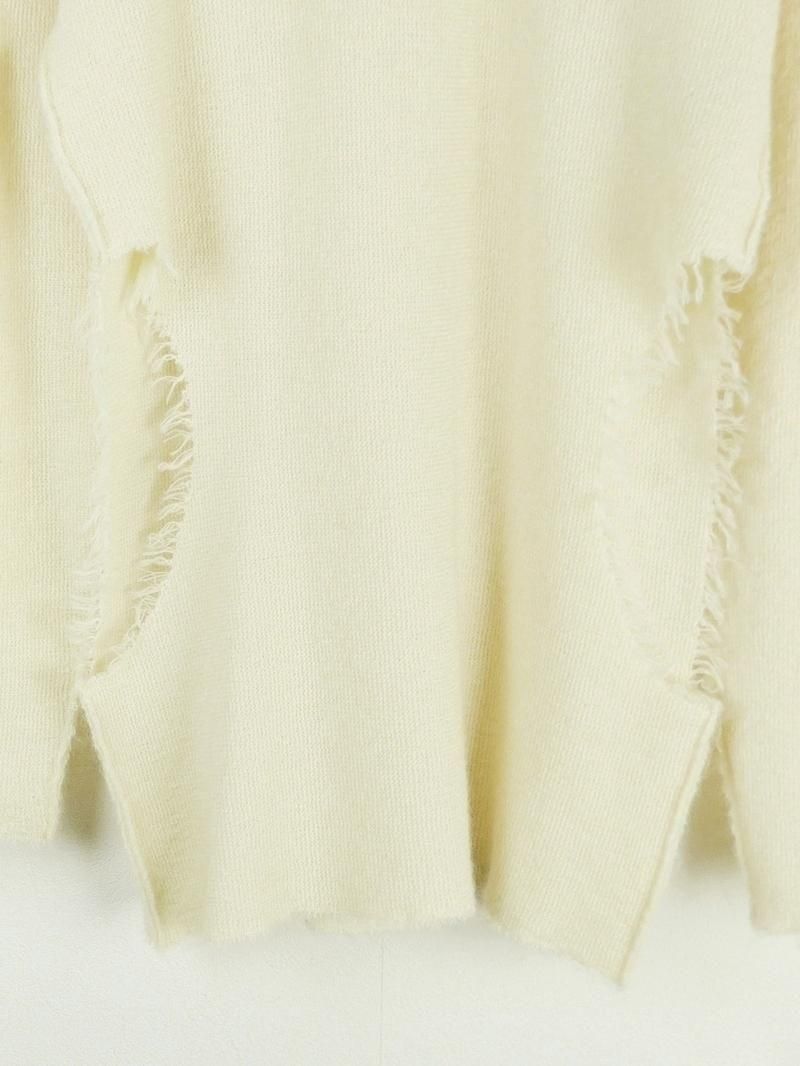 カットオフのトリミングと両サイドの大胆なダメージホールが目を惹く、TOGAらしいユニークなデザインのニットアイテム。