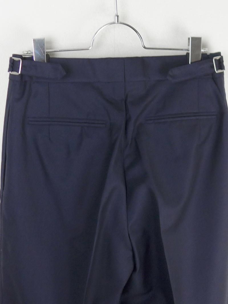 ハイウエストパンツ一辺倒のなか、腰を落として履くスラックスラインが新鮮な一本です。