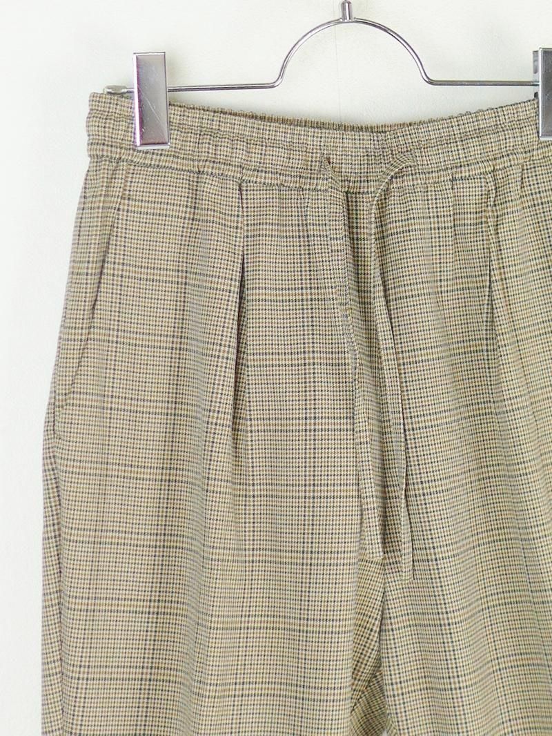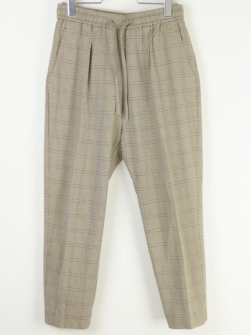 ヨリ2019AWのチェックタックパンツ。 細かいガンクラブ・チェックがクラシカルな印象のスリムテーパードパンツ。 ウエストゴムとストレッチ入り素材でストレスフリーに履ける一本です。