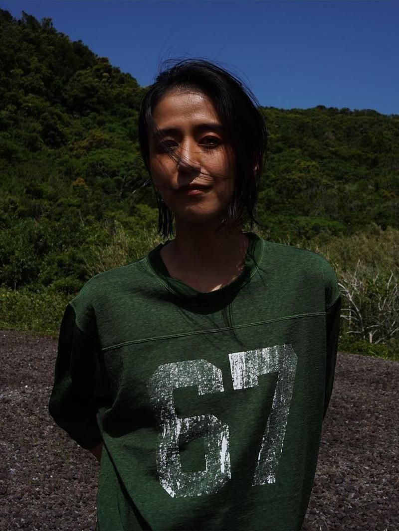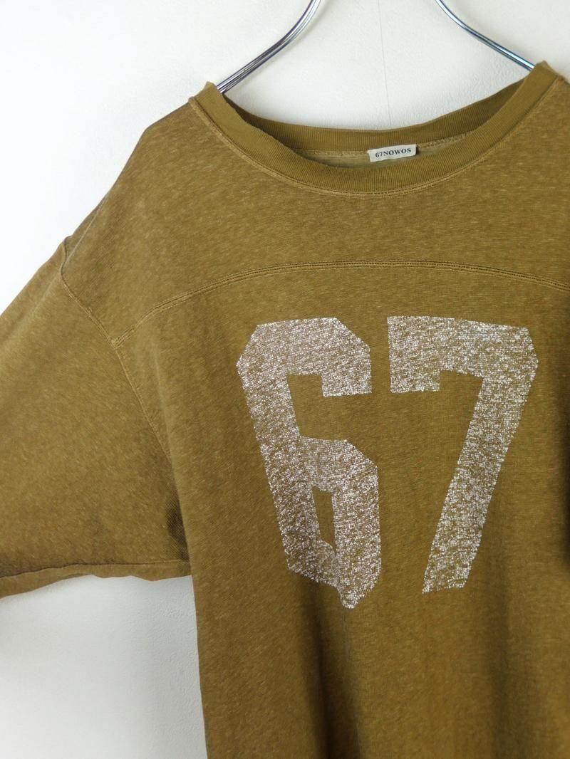 ヴィンテージのような風合いたっぷりのコットンレーヨンカットソーに、同じくヴィンテージライクなひび割れプリントで“67”ナンバリングを施した一枚。